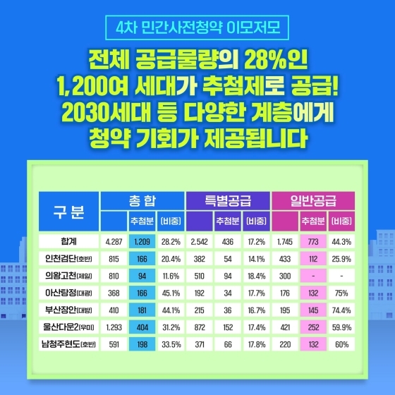 전체 공급물량의 28%인 1,200여 세대가 추첨제로 공급! 2030세대 등 다양한 계층에게 청약 기회가 제공됩니다.